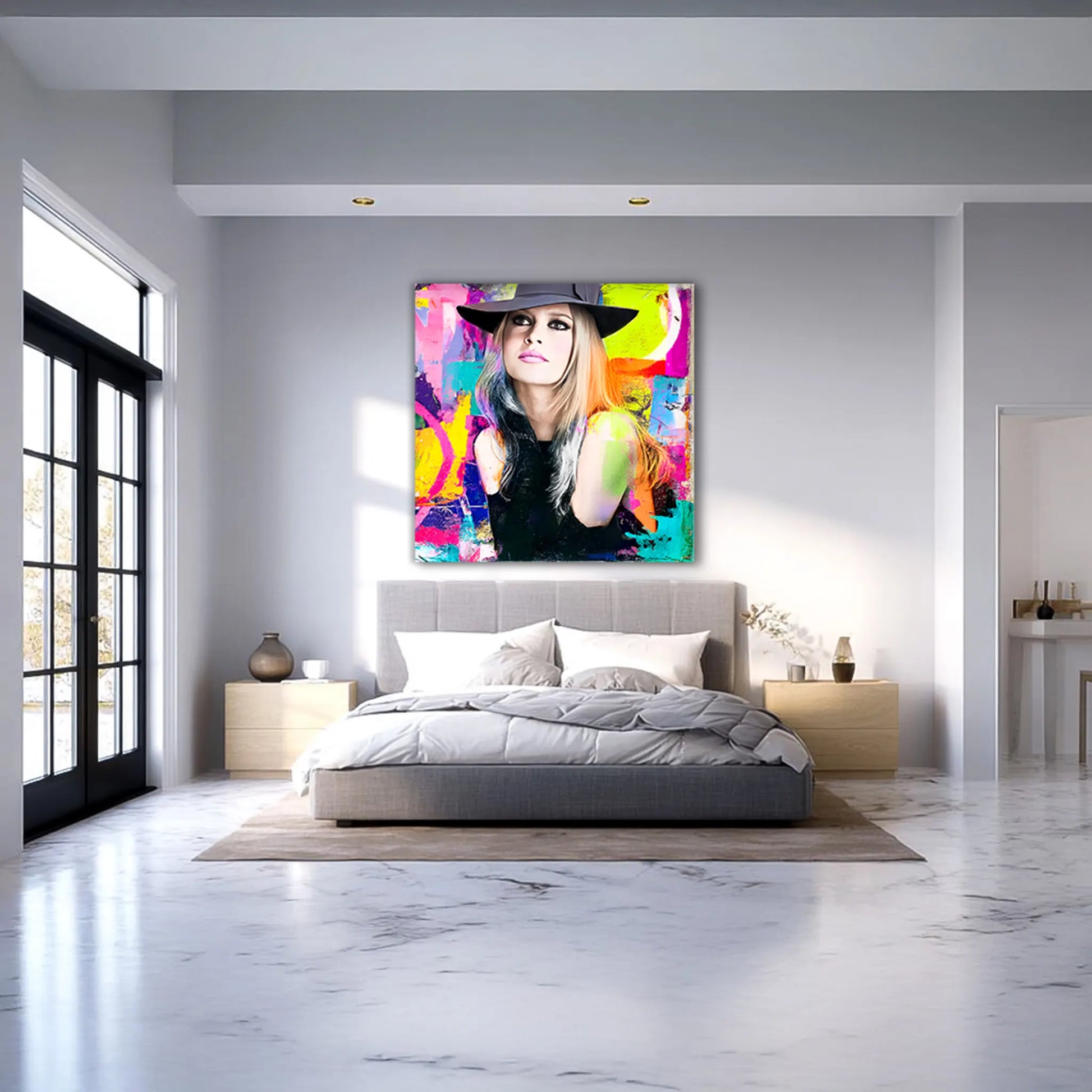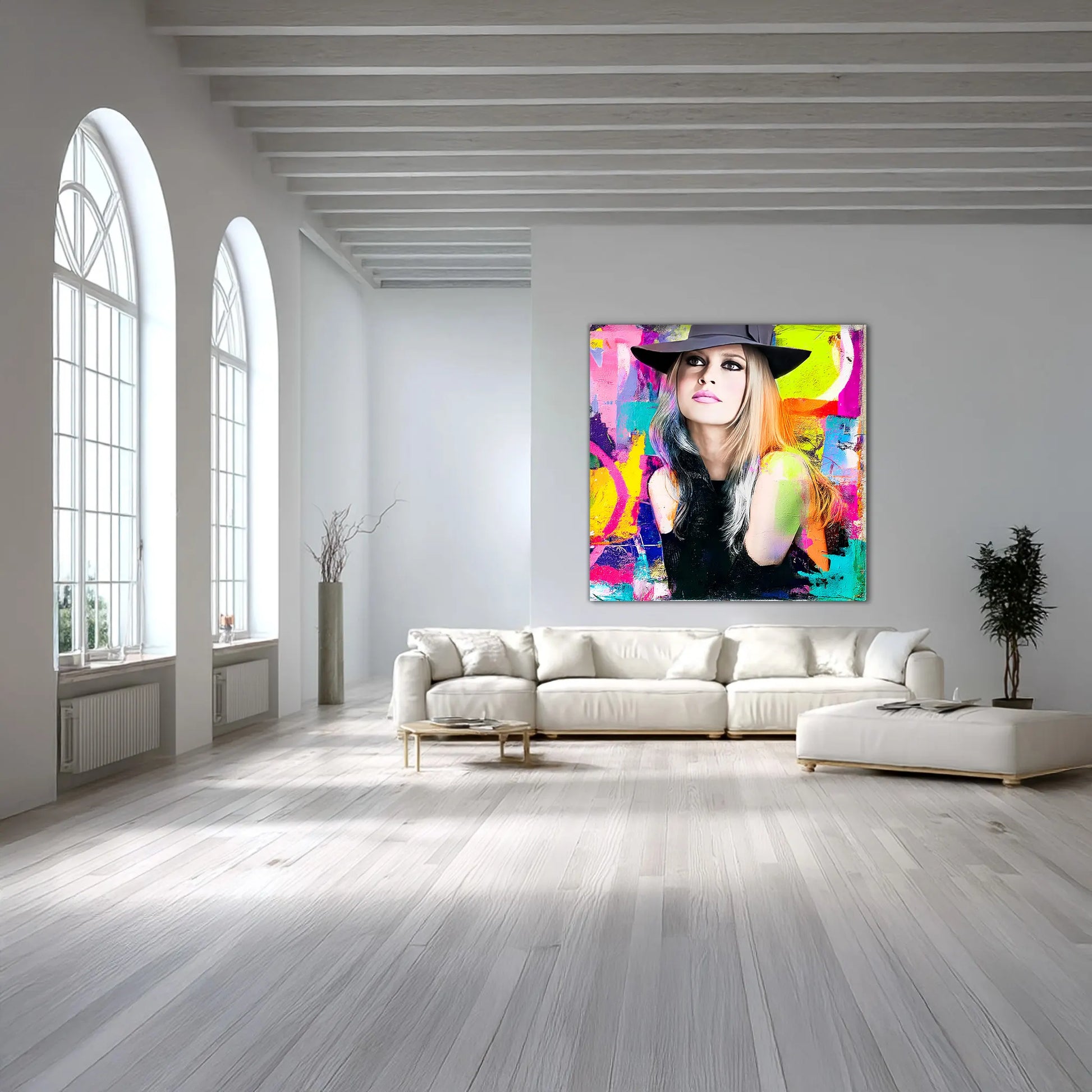 Add a burst of bold expression to your walls with Brigitte in Color, a vivid pop art portrait inspired by Brigitte Bardot’s iconic beauty. The piece blends fashion-inspired realism, vibrant hues, and paint-splash textures to create a dynamic and cinematic composition.